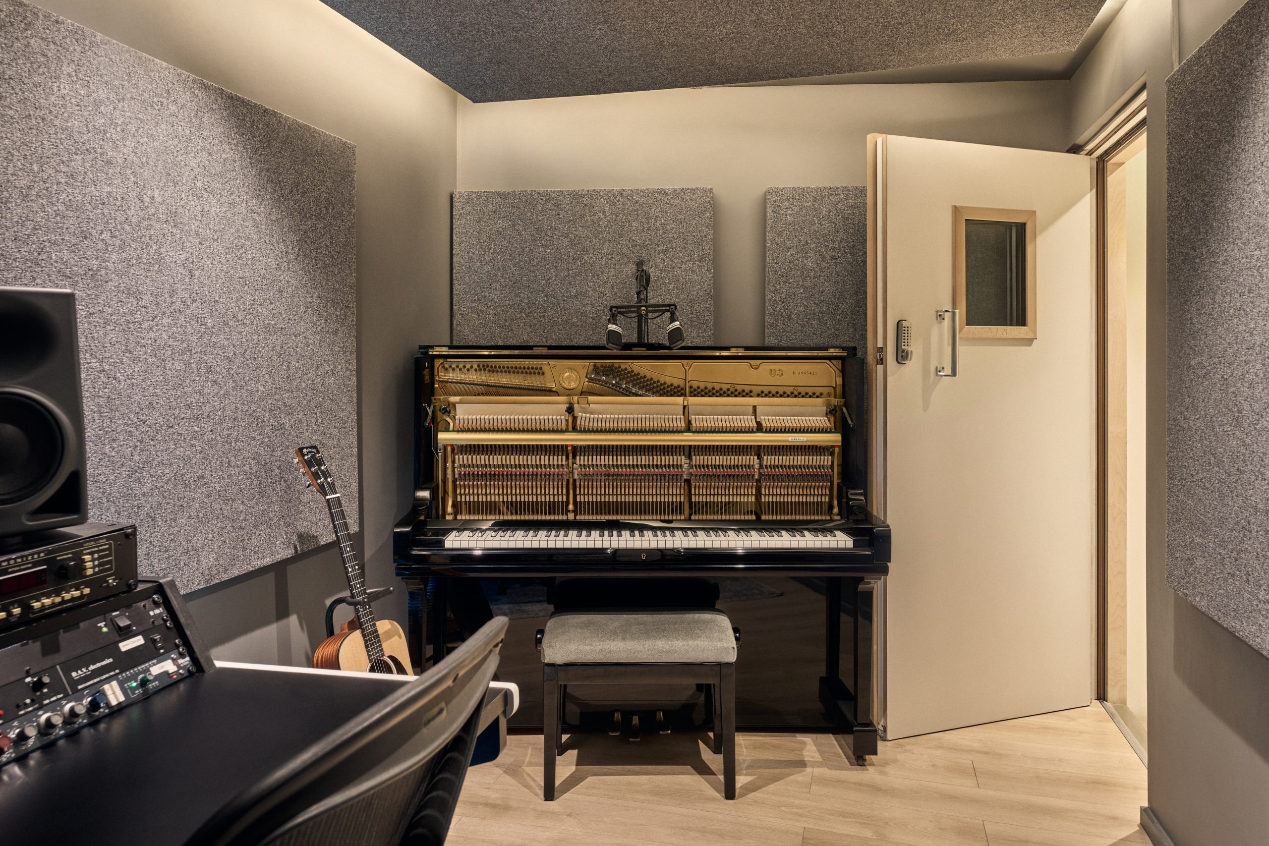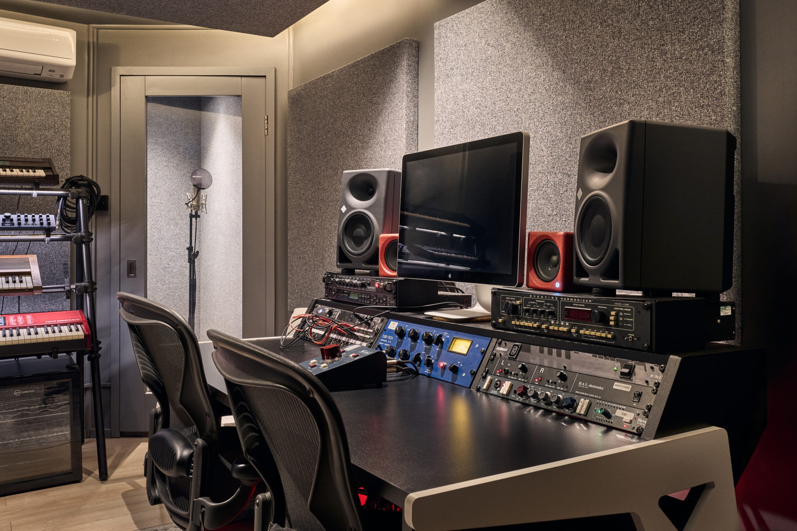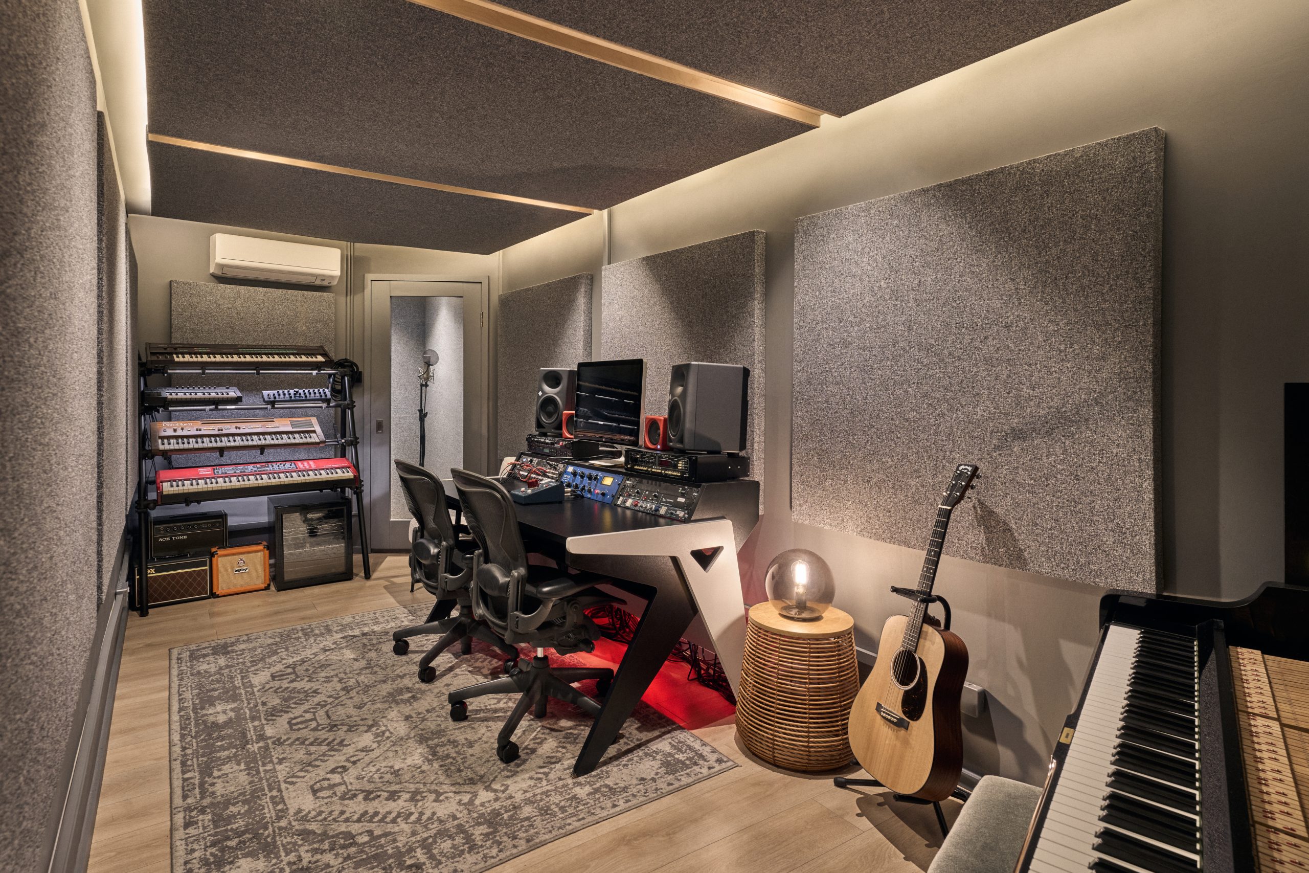 An intimate space for writing sessions, offering the ultimate vocal signal chain and a diverse array of instruments including a Juno 6, Rhodes mk1 and Yamaha U3 Piano. Designed with our signature aesthetic.